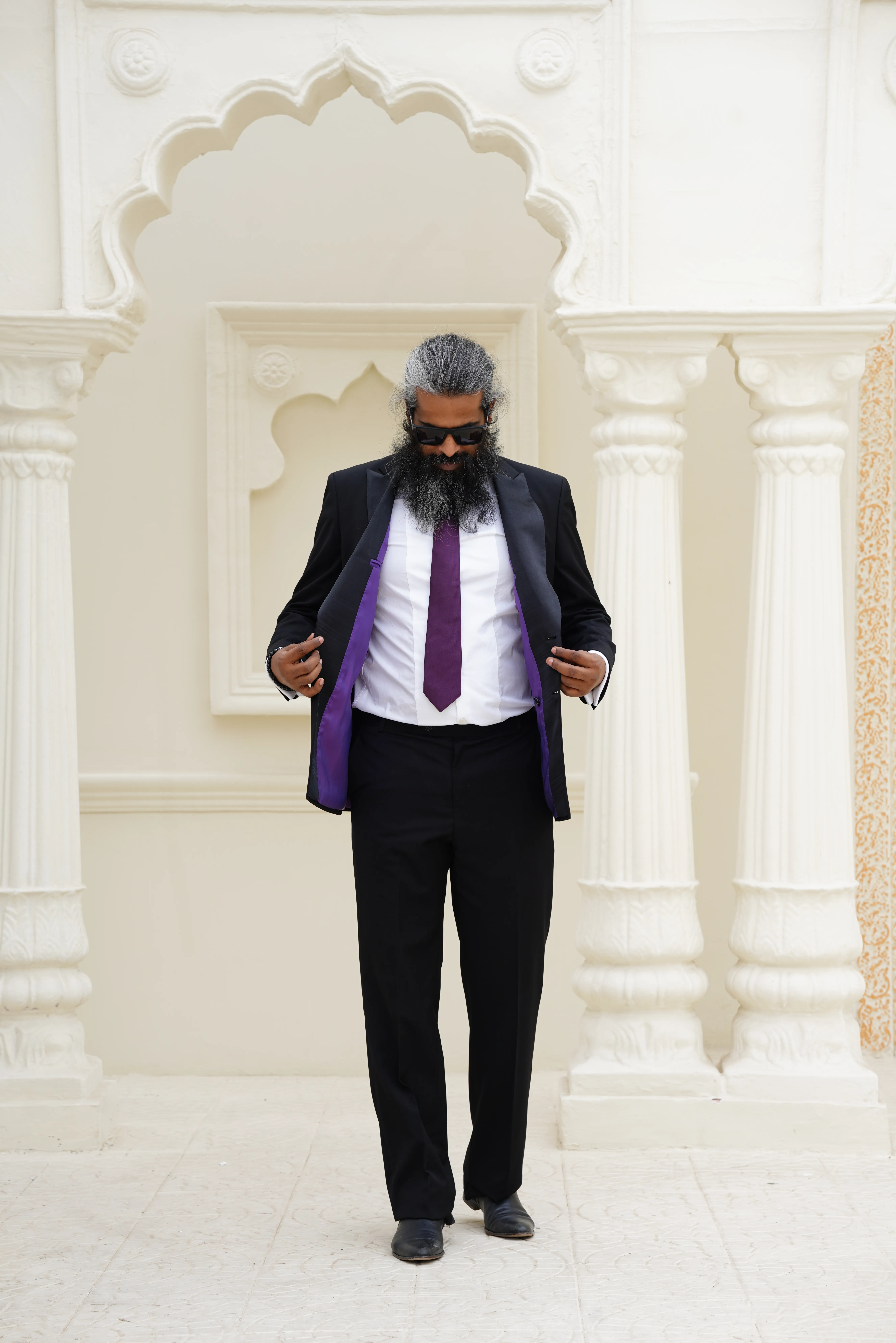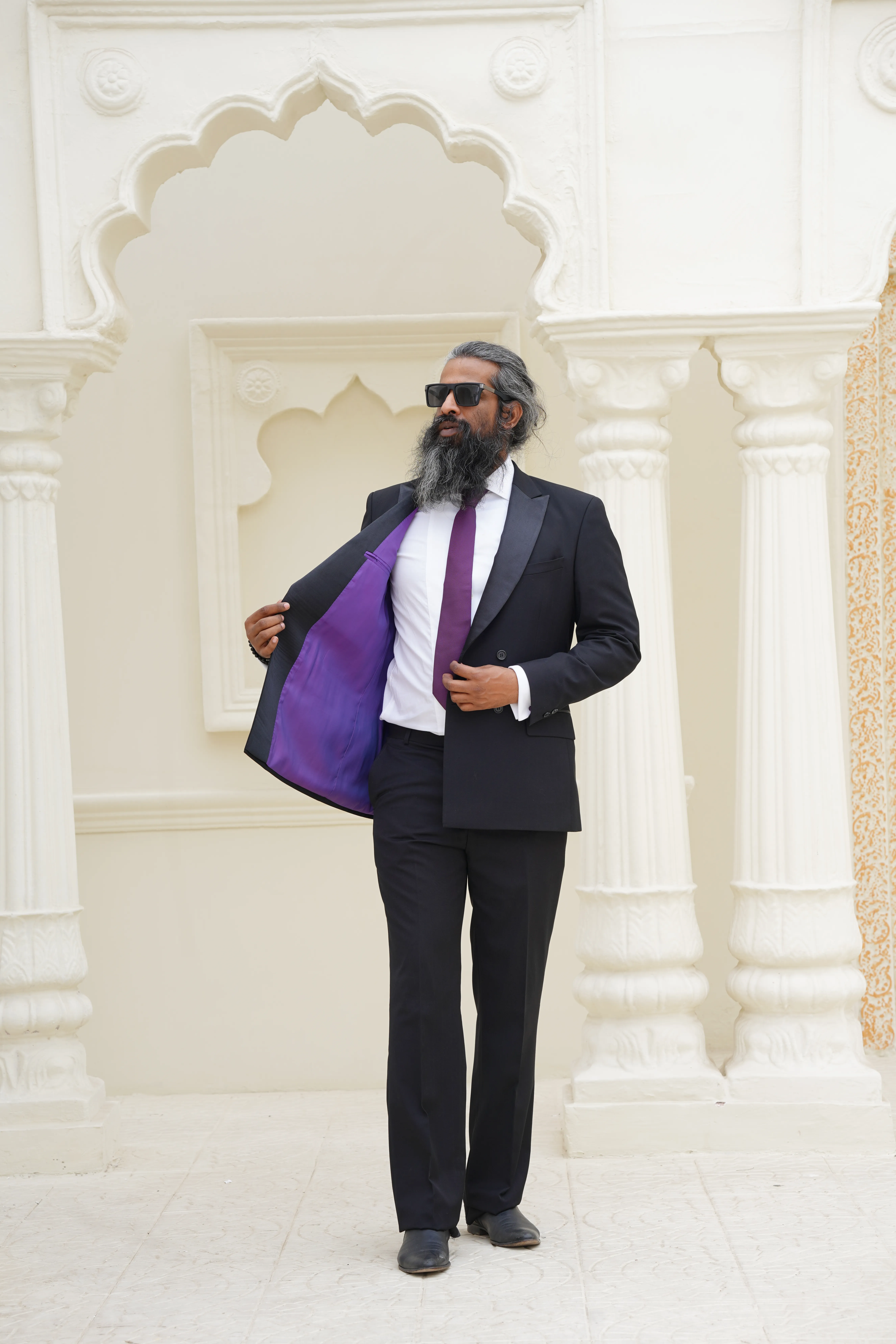 - Jacket has notched lapels; nonfunctional four-button cuffs; chest pocket; flap pockets; side vents